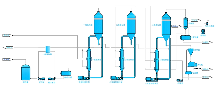 在多效蒸發(fā)器中,可將二次蒸器當作加熱蒸汽,引入另一個蒸發(fā)器,只要后者蒸發(fā)室壓力和溶液沸點均較原來蒸發(fā)器中的為低,則引入的二次蒸汽即能起加熱熱源的作用。同理,第二個蒸發(fā)器新產(chǎn)生的新的二次蒸汽又可作為第三蒸發(fā)器的加熱蒸汽。這樣,每一個蒸發(fā)器即為一效,將多個蒸發(fā)器連接起來一同操作,即組成一個多效蒸發(fā)系統(tǒng)。加入生蒸汽的蒸發(fā)器稱為第一效,利用第一效二次蒸汽加熱的成為第二效,依次類推。